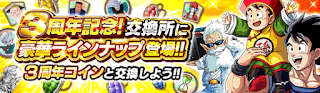 2周年などでも交換可能だった歴代孫悟空や大界王などと交換できる3周年コインです。強力なサポートアイテム、セレクトドッカンフェスキャラの覚醒メダル、修業アイテム、ふしぎな砂時計など色々なアイテムがあります。